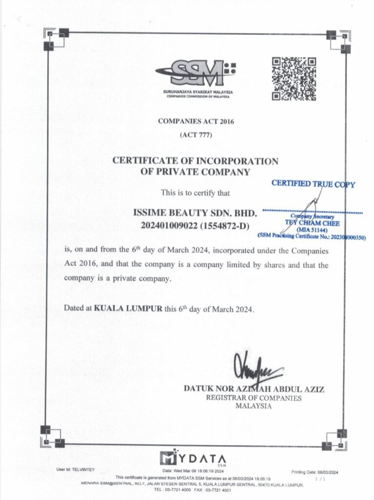 Issime Beauty Sdn. Bhd. is a legally registered company in Malaysia under the Suruhanjaya Syarikat Malaysia (SSM). Our official registration reflects our commitment to professionalism, transparency and customer trust.